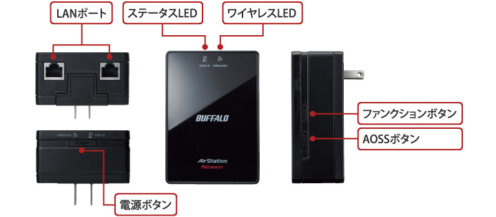 | 主な同梱品 | 本体、 LANケーブル(ストレート 2m)、ACコード、ACアタッチメント、壁掛け用プレート 壁掛け用ねじ(2本)、エアナビゲータCD(エアナビゲータ、クライアントマネージャV、クライアントマネージャ3、AOSSアシスタント、マニュアル) マニュアル ※保証書はパッケージに記載 |