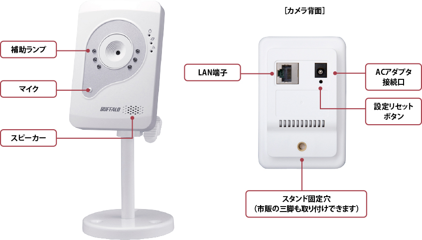 | 製品構成 | ・カメラ本体 ・ACアダプター ・スタンド ・スタンド固定用ネジ ・壁取り付け用アンカー ・おうちカムナビゲーターCD ・セットアップカード ・取扱説明書 ・保証書 | |