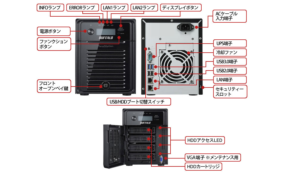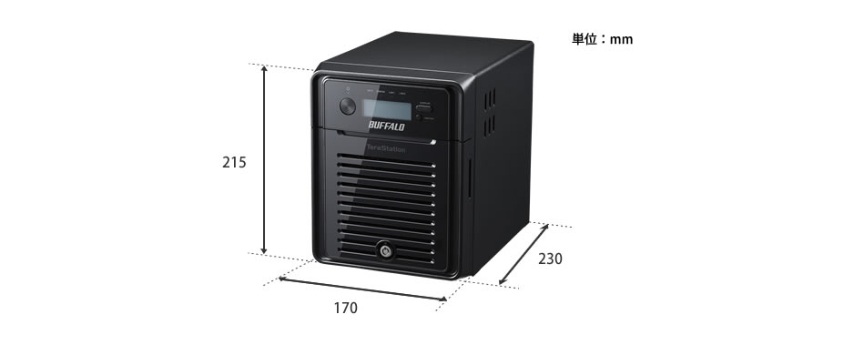 | 主な付属品 | ツメが折れないLANケーブル(カテゴリー6、ストレート、2m)、電源ケーブル(1.6m)、3極-2極変換アダプター、フロントパネル開閉用鍵 (2個)、USBメモリー(ユーティリティー内蔵:NAS Navigator2、TeraNavigator、NovaBACKUP、Adobe Reader) 、取扱説明書、保証書 | |