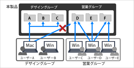 例えば、デザイングループのAさんは、デザイングループのフォルダーにはアクセスできますが、営業グループのフォルダーにはアクセスできません。デザイングループのフォルダーの中のBフォルダーは、読取専用とすることで書込みはできません。