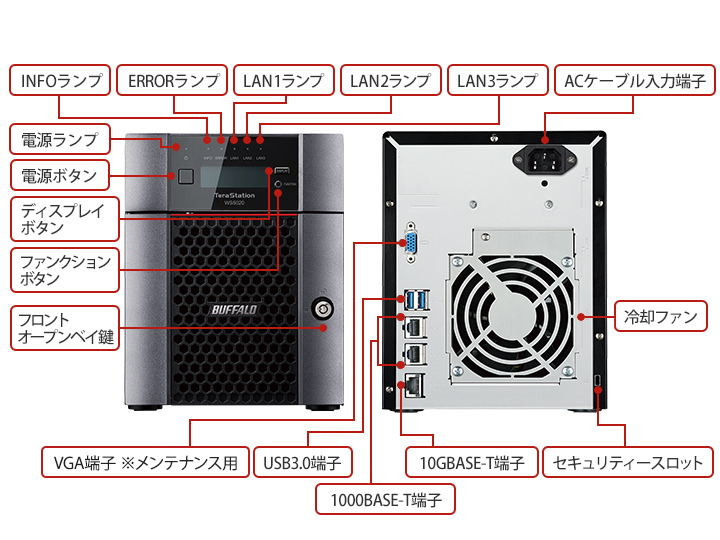 | 主な付属品 | LANケーブル(カテゴリー6A、ストレート、2m)、電源ケーブル、3極-2極変換アダプター、フロントパネル開閉用鍵 (2個) 、ケーブル抜け防止バンド、USBリカバリメディア、取扱説明書、保証書 | |
