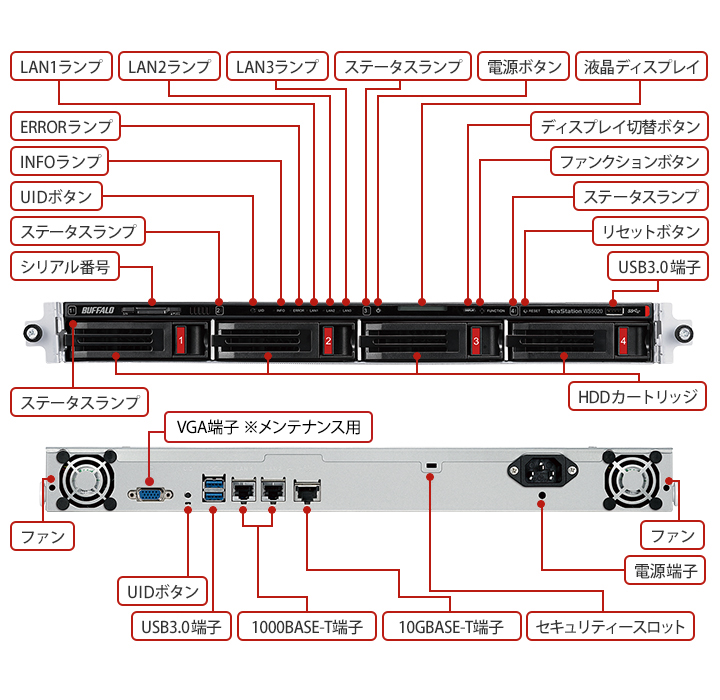 | 主な付属品 | LANケーブル(カテゴリー6A、ストレート、2m)、電源ケーブル(1.6m、コンセント側 NEMA 5-15P、電源ユニット側 IEC 60320 C13)、3極-2極変換アダプター、ラック取付金具一式 、USBリカバリメディア、取扱説明書、保証書 | |