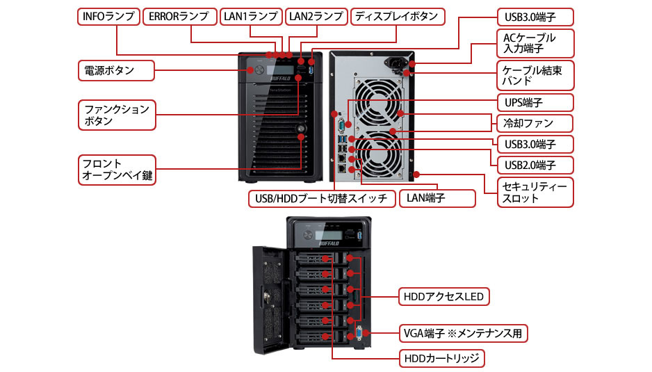 | 主な付属品 | ツメが折れないLANケーブル(カテゴリー6、ストレート、2m)、電源ケーブル(1.6m)、3極-2極変換アダプター、フロントパネル開閉用鍵 (2個) 、USBメモリー(ユーティリティー内蔵:NAS Navigator2、TeraNavigator、NovaBACKUP、Adobe Reader) 、取扱説明書、保証書 | |
