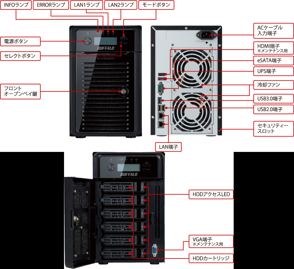 | 主な付属品 | LANケーブル(2m)、電源ケーブル、CD(TeraNavigator、NASnavigator)、3ピン-2ピン変換アダプター、USBリカバリディスク、取扱説明書、保証書 | |
