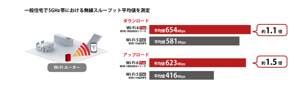 Wi-Fi 5(11ac)ルーターを、Wi-Fi 6 (11ax)ルーターに置き換えることで、無線スループットの向上が見込めます。従来の Wi-Fi 5(11ac)ルーターWSR-1166DHP4を、本商品の同等品(WSR-1800AX4)に置き換えた場合、5GHz帯のダウンロードは約1.1倍、アップロードは約1.5倍の無線スループットを実測することができました。