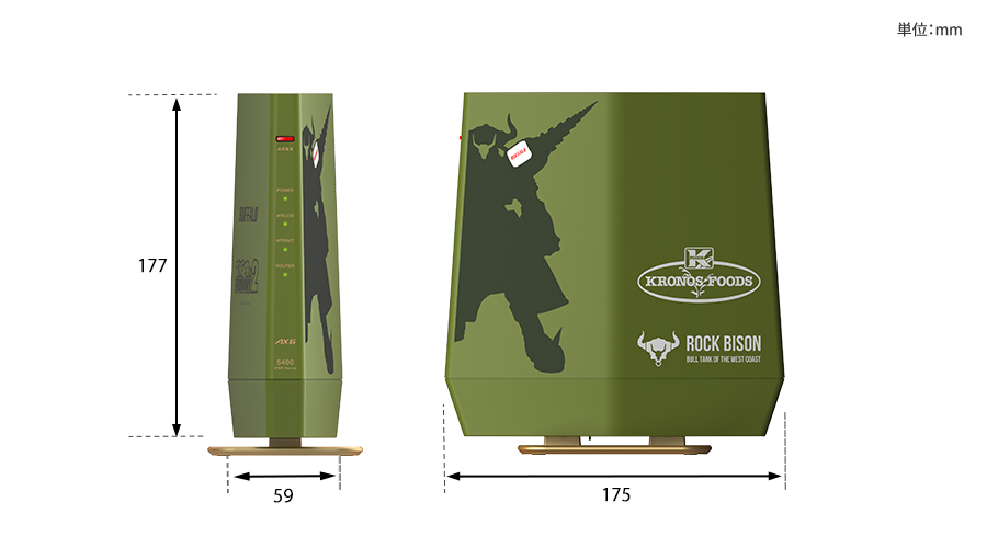 製品前面の右側には、ロックバイソンの所属企業であるクロノスフーズ社のロゴと、ロックバイソンをイメージしたオリジナルグラフィックを配置。