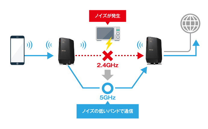 EasyMeshによる接続は、2.4GHzと5GHzの両バンドに対応しています。使用中のバンドで電子レンジなどのノイズによる切断が発生した場合、自動でノイズの少ないバンドに移動して接続するため、環境の影響を受けずに安定した通信を維持できます。