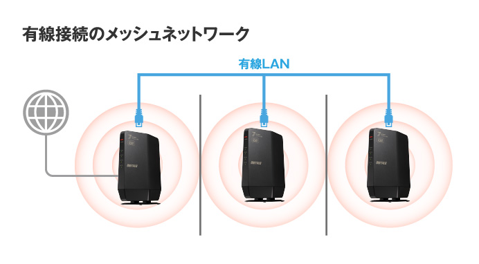 EasyMeshは、無線接続だけでなく、有線接続でもメッシュネットワークを実現できます。鉄筋コンクリート造や鉄骨造の建物でも、メッシュネットワークを利用できます。