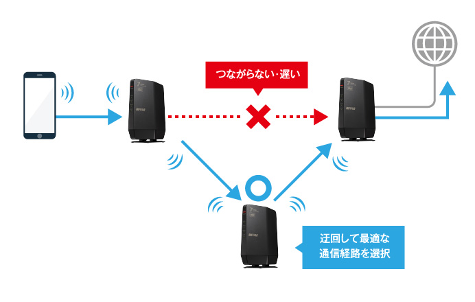 EasyMeshは最適な通信経路を自動で選択します。通信中の経路がつながらない・遅い状態になっても、より早くつながる経路を再選択して通信します。電波環境が変わっても安定してつながる環境を実現します。