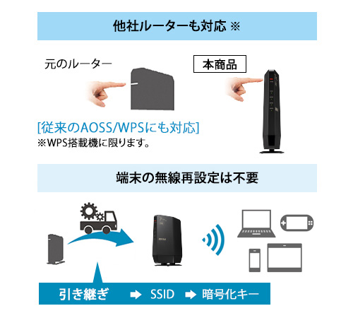 新旧それぞれのルーターのAOSS/WPSボタンを押すだけで本商品に無線設定を引き継げます。