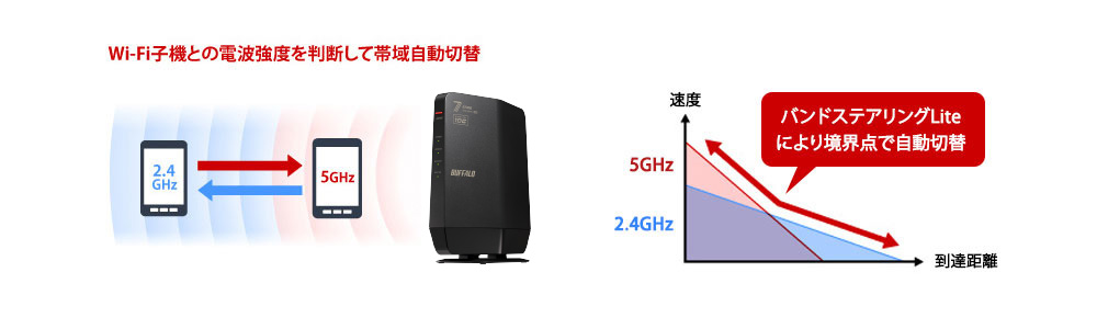 Wi-Fi子機との電波強度を判断し、遠くまで届く2.4GHz帯と速度の速い5GHz帯の帯域切替を自動で行う「バンドステアリングLite」機能搭載。部屋中どこでも快適に通信できます。