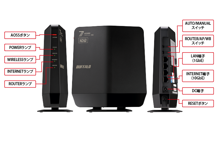 | 有線LANインターフェース | 伝送速度 | LANポート:最大1Gbps(1G/100M/10Mbps)×3 INTERNETポート:最大10Gbps(10G/5G/2.5G/1G/100Mbps)×1 ※INTERNETポートは1000BASE-Tのみ半二重に対応しています。 |