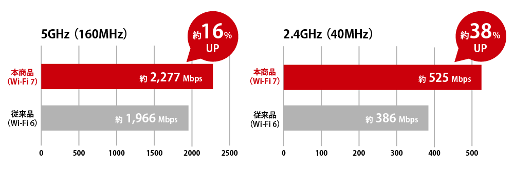 Wi-Fiルーター(本商品または従来品)にノートPCをWi-Fi 7(本商品)/Wi-Fi 6(従来品)で接続。ノートPCをWi-Fiルーターから見通しの良い2.5m離れた位置で0°~270°まで90°ずつ回転させ4回測定。サーバーPC→Wi-Fiルーター→ノートPCの通信を約30秒間測定し、平均を算出。(2026年3月当社調べ)