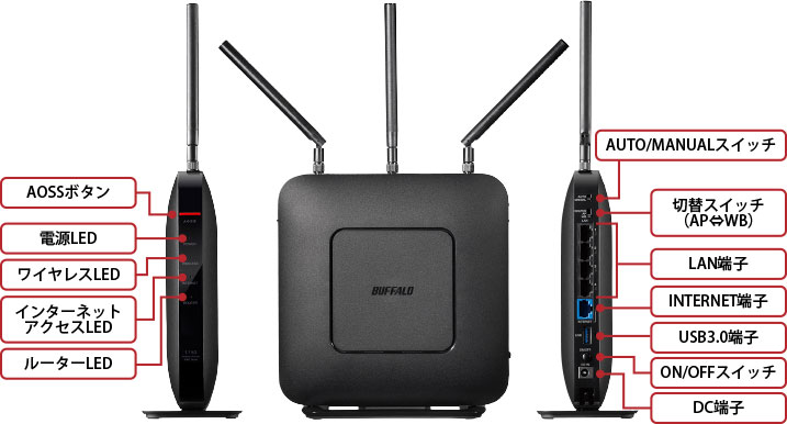 | データ転送速度(理論値) | 最大1300Mbps(IEEE802.11ac)、最大450Mbps(IEEE802.11n)、最大54Mbps(IEEE802.11a、IEEE802.11g)、最大11Mbps(IEEE802.11b) | |