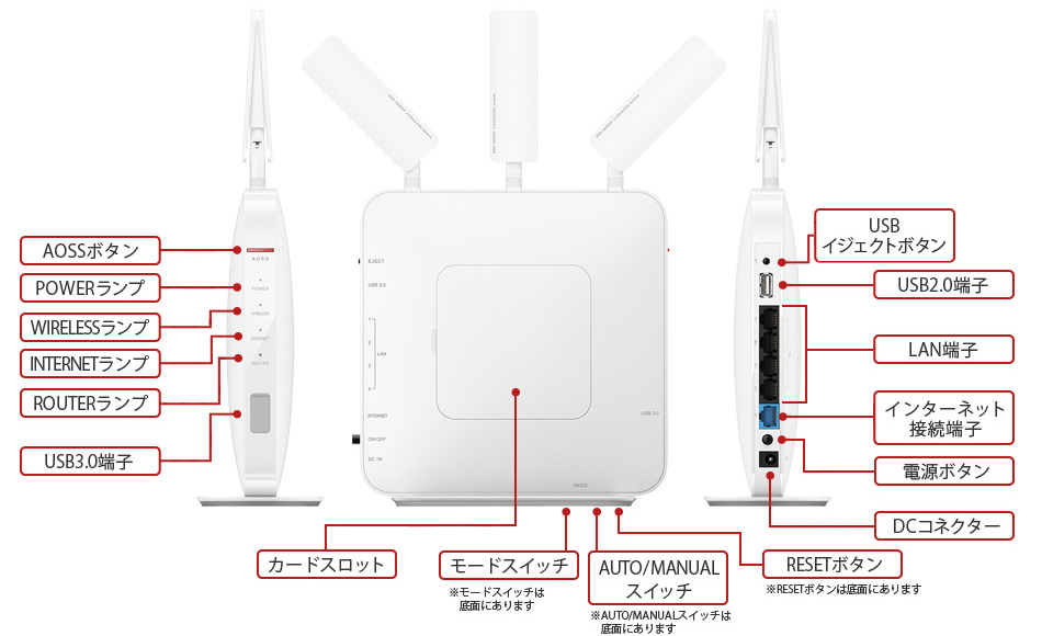 | データ転送速度(理論値) | 最大1300Mbps(IEEE802.11ac)、最大450Mbps(IEEE802.11n)、最大54Mbps(IEEE802.11a、IEEE802.11g)、最大11Mbps(IEEE802.11b) | |