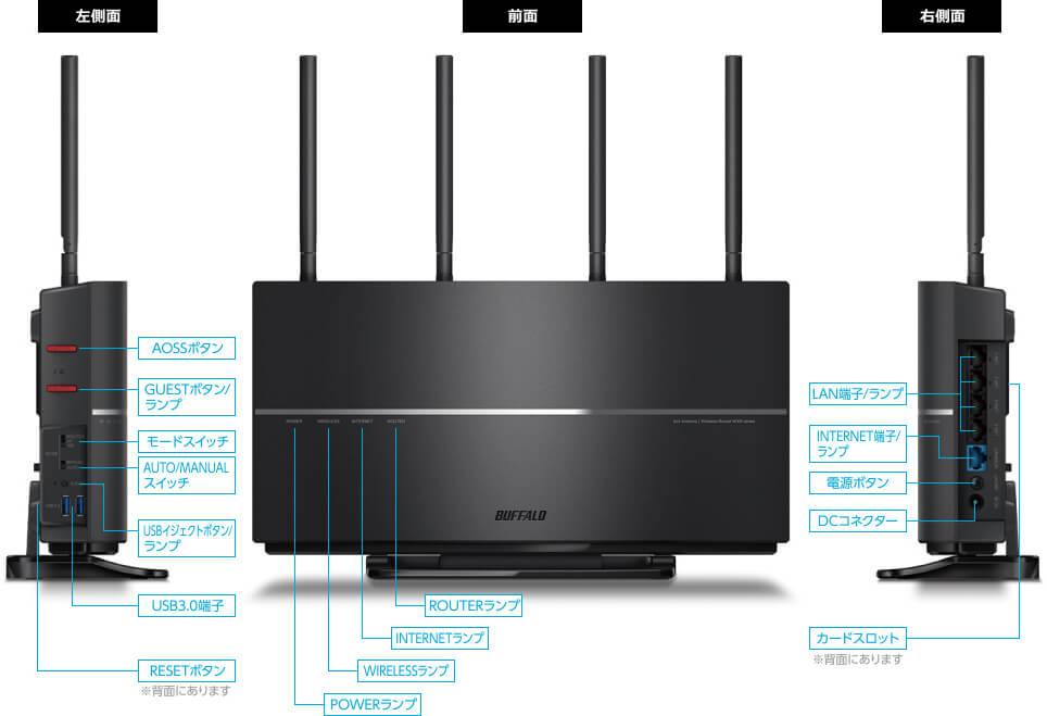 | 主な付属品 | スタンド(本体装着済み)、アンテナ、LANケーブル(ストレート/カテゴリー5e:2m)、ACアダプター、取扱説明書 ※保証書はパッケージに記載 |