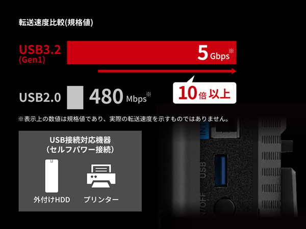 | 端子形状 | USB Type-A×1 ※初期設定はUSB 2.0(Web設定画面よりUSB 3.2(Gen1)に切り替え可能です。) |