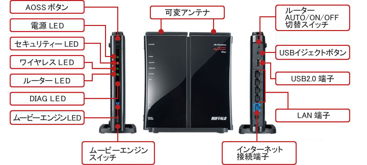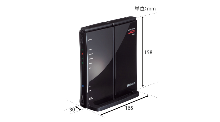 | 主な付属品 | WZR-300HP | 縦置き・横置き用スタンド(ゴム足付き、壁掛け機能あり)、壁取付け用ねじ2本、LANケーブル(ストレート、2m) 、ACアダプター、マニュアル、セットアップカード、取扱説明書 ※保証書はパッケージに記載 |