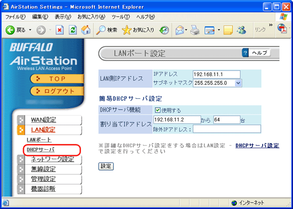 AirStationのDHCPサーバ機能(IPアドレス自動割当機能)の設定を変更する DHCPサーバ機能(IPアドレス自動割当機能)の設定を変更するときは、以下の手順で行います。 1. AirStationの設定画面を表示します。 設定画面を表示する 2. 詳細設定画面を表示します。 [詳細設定]をクリックします。 3. LAN設定画面を表示します。 画面左の[LAN設定]をクリックします。 4. DHCPサーバ設定画面を表示します。 画面左の[DHCPサーバ]をクリックします。 5. DHCPサーバ機能を設定します。 設定例: IPアドレスの自動割り当てを行うパソコンなどの台数を100台に変更する場合は、[割り当てIPアドレス]の台数を[100]に書き換えます。 割り当てIPアドレスの値を変更する場合は、AirStationのIPアドレスとネットワークアドレスが同じになるように設定してください。 6. 変更した設定を登録します。 手順5の画面で[設定]をクリックします。