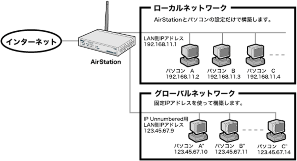 AirStationは、IP Unnumbered機能に対応しています。IP Unnumbered機能を使用することで、プロバイダから配布された複数のグローバルIPアドレスをAirStationに接続した各パソコンで使用できます。