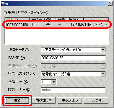クライアントマネージャを使用してAirStationに接続する ここでは、無線パソコンからクライアントマネージャを使用してAirStationに接続する手順を説明します。 1. クライアントマネージャを起動します。 デスクトップ上にある「クライアントマネージャ」アイコンをダブルクリックします。 もしくは[スタート]-[プログラム]-[BUFFALO(MELCO INC)]-[エアステーションユーティリティ]- [クライアントマネージャ]を選択します。 2. [検索]をクリックします。 3. AirStationに接続します。 「検出されたアクセスポイント」欄に表示されているAirStationを選択し、[接続]をクリックします。 ※ 暗号欄に○の記号が表示されている場合は、AirStationに暗号キー(WEP)が設定されています。 「暗号化キー」欄にAirStationに設定されている暗号キー(WEP)を入力し[接続]をクリックして ください。 ※ 複数のAirStationが検出された場合は、接続先AirStationのESSID(SSID)を確認のうえ、 接続してください。 [接続]をクリックすると、以下の画面が表示され、AirStationに接続されます。 以下の画面のように、AirStationが黒文字で表示されたら、接続は完了です。 ※ AirStationによっては、「エアステーション名」が表示されないことがありますが、 異常ではありません。