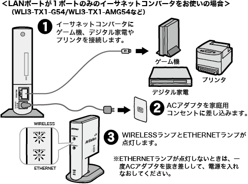 ■ ゲーム機/デジタル家電/プリンタへの接続 設定が完了したイーサネットコンバータとゲーム機/デジタル家電/プリンタを接続します。