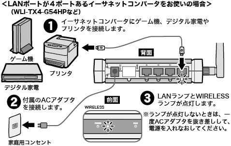 最初にイーサネットコンバータとパソコンを接続して設定をおこなった後、イーサーネットコンバータをゲーム機/デジタル家電/プリンタと接続します。