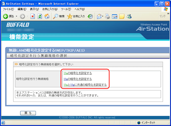 AirStationの設定画面が表示されたら、[無線LANの暗号化を設定する(WEP/TKIP/AES)]をクリックします。