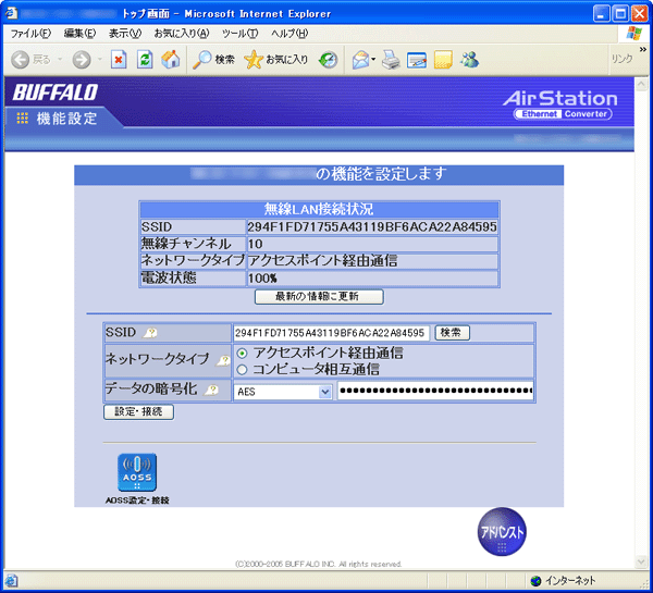 このボタンをクリックすると、イーサネットコンバータがセキュリティーキー交換処理を行える状態(AOSS動作状態)になります。