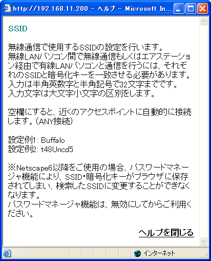 使い方をヘルプで見る 設定画面では、各項目の内容を説明したヘルプを見ることができます。 ヘルプは以下の手順で表示します。 1. イーサネットコンバータの設定画面を表示します。 設定画面を表示する 2. ヘルプを表示します。 画面にある アイコンをクリックすると、ヘルプが表示されます。 「WEB設定画面(イーサネットコンバータ)」に戻る