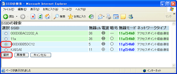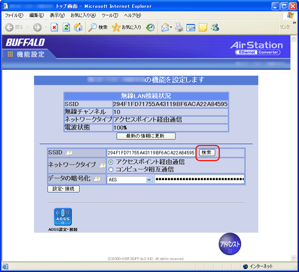 AirStationに接続する イーサネットコンバータの設定画面を使って、AirStationに接続します。 1. イーサネットコンバータの設定画面を表示します。 設定画面を表示する 2. AirStationを検索します。 [検索]をクリックします。 3. 検索されたAirStationを選択し、[選択]をクリックします。 4. AirStationに接続します。 AirStationに暗号キーが設定されている場合は、暗号キーを入力し、[設定・接続]をクリックします。 暗号キーが設定されていない場合は、「暗号化しない」を選択して、[設定・接続]をクリックします。 以上で接続は完了です。 「WEB設定画面(イーサネットコンバータ)」に戻る