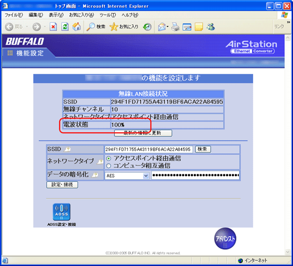 AirStationとの接続状態を確認する イーサネットコンバータの設定画面を使って、AirStationとの接続状態を確認します。 Windowsパソコンをお使いの場合は、イーサネットコンバータマネージャからでも接続状態を確認することができます。 イーサネットコンバータマネージャで接続状態を確認する 1. イーサネットコンバータの設定画面を表示します。 設定画面を表示する 2. 接続状態を確認します。 「電波状態」欄で接続状態を確認します。 電波状態が悪い場合は、以下の対策を試みてください。 1.無線パソコンをAirStationに近づけます。 (ただし、30cm以内には近づけないでください) 2.AirStationの位置を変更します。 3.AirStationと無線パソコン間の見通しをよくします。 4.AirStation、無線パソコンの近くに電子レンジ等の 電波発生源がないことを確認します。 「WEB設定画面(イーサネットコンバータ)」に戻る