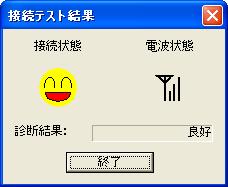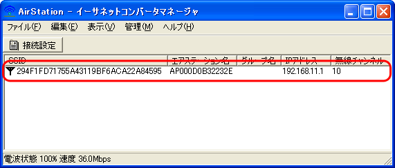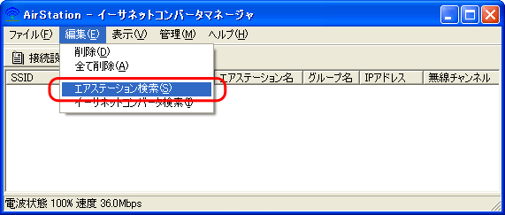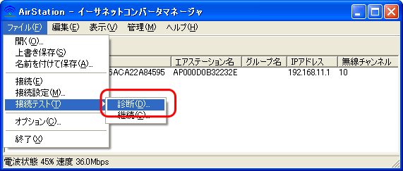 イーサネットコンバータマネージャで接続状態を確認する Windowsパソコンをお使いの場合は、イーサネットコンバータマネージャを使って、以下の手順で接続状態を確認することができます。 イーサネットコンバータマネージャがパソコンにインストールされていない場合は、以下の手順をおこなう前にインストールしてください。 インストール手順は、「イーサネットコンバータマネージャのインストール」を参照してください。 1. イーサネットコンバータマネージャを起動します。 [スタート]-[(すべての)プログラム]-[BUFFALO]-[イーサネットコンバータ]-[イーサネットコンバータマネージャ]を選択します。 以下の画面が表示されたら、お使いのLANアダプタを選択します。 2. AirStationを検索します。 [編集]-[エアステーション検索]を選択します。 3. AirStationが表示されることを確認します。 4. 接続状態を確認します。 [ファイル]-[接続テスト]-[診断]を選択します。 接続テストが開始されますので、送信パケット数が100になるまでお待ちください。 5. 接続テストの結果が表示されます。 接続状態 電波状態 最適 最適 良好 良好 悪い 問題あり 最悪 悪い 通信不可 接続状態と電波状態の結果を総合的に判断して、診断結果が表示されます。 良好: 総合的に問題ありません。 不適合: 不安定な状態であることを示します。 電波状態が悪い場合は、以下の対策を試みてください。 1.無線パソコンをAirStationに近づけます。 (ただし、30cm以内には近づけないでください) 2.AirStationの位置を変更します。 3.AirStationと無線パソコン間の見通しをよくします。 4.AirStation、無線パソコンの近くに電子レンジ等の 電波発生源がないことを確認します。