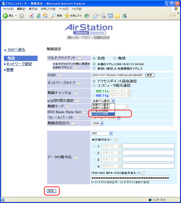 「a/g切り替え設定」欄で「11gのみ使用」を選択し、[設定]をクリックします。