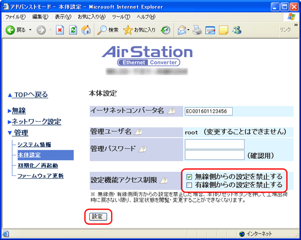アクセス制限を設定すると、イーサネットコンバータの設定画面を無線側から表示できなくしたり、有線側から表示できなくすることができます。