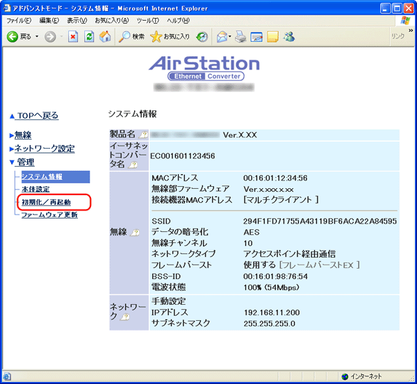 設定を初期化する イーサネットコンバータの設定画面を使って、イーサネットコンバータの設定を初期化します。 1. イーサネットコンバータの設定画面を表示します。 設定画面を表示する 2. アドバンスト情報画面を表示します。 [アドバンスト]をクリックします。 3. 画面左の[管理]をクリックします。 4. 画面左の[初期化/再起動]をクリックします。 5. 設定を初期化します。 [設定初期化]をクリックします。 6. 以降は、画面の指示にしたがってください。 「WEB設定画面(イーサネットコンバータ)」に戻る