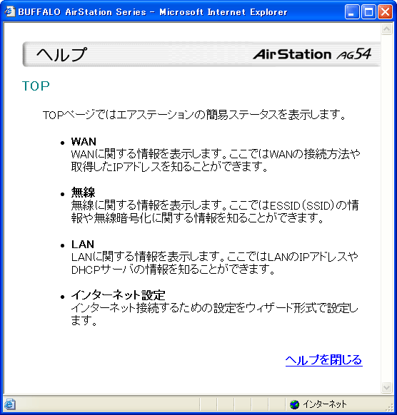 使い方をヘルプで見る 設定画面では、各項目の内容を説明したヘルプを見ることができます。 ヘルプは以下の手順で表示します。 1. AirStationの設定画面を表示します。 設定画面を表示する 2. ヘルプを表示します。 画面の右上にある ボタンをクリックすると、ヘルプ画面が表示されます。 「AirStationの設定画面の使い方」へ戻る