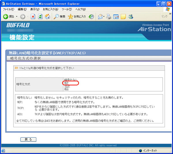 (外部からの不正アクセスや無線パケットの解析を防ぐため、802.11a/802.11gの両方に暗号化の設定を行うことをおすすめします)