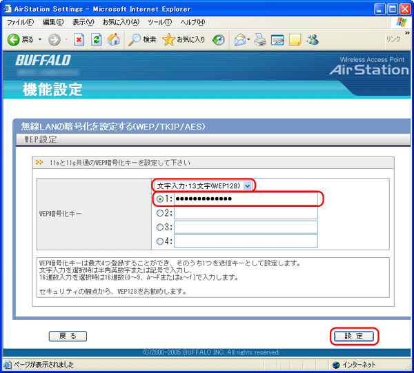 5. 暗号キーを設定します。 入力形式を指定し、[WEP暗号化キー]を入力して、[設定]をクリックします。
