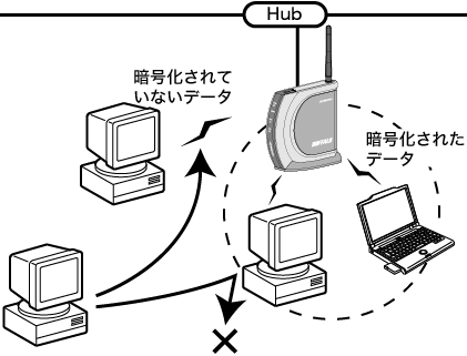WEP機能で無線パケットを暗号化することにより、外部からの無線パケット解析を防ぎます。