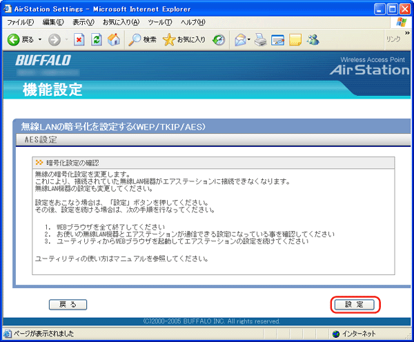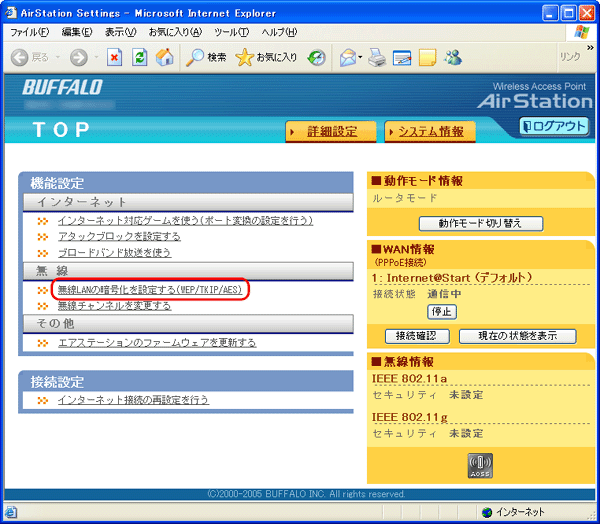 1. AirStationのAOSS機能を無効にします。 2. AirStationの設定画面を表示します。 3. 機能設定画面を表示します。 [無線LANの暗号化を設定する(WEP/TKIP/AES)]をクリックします。