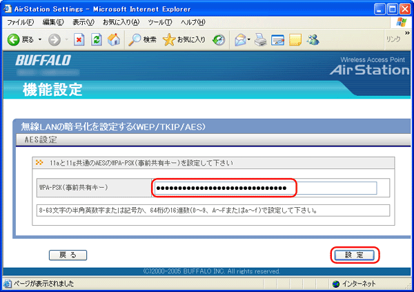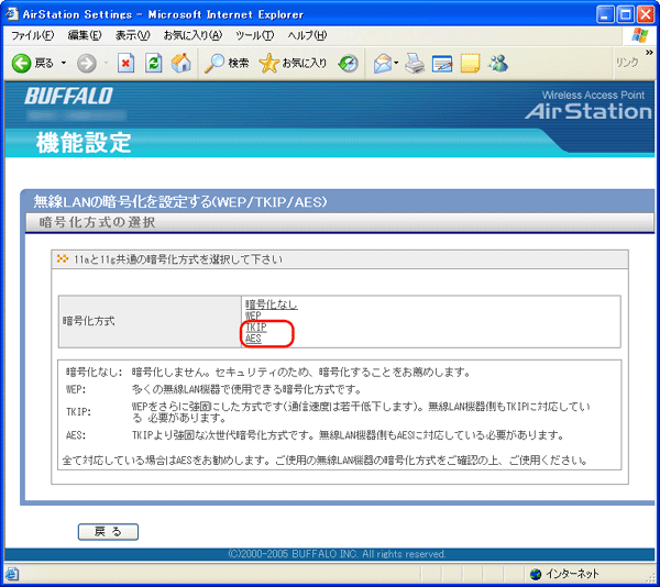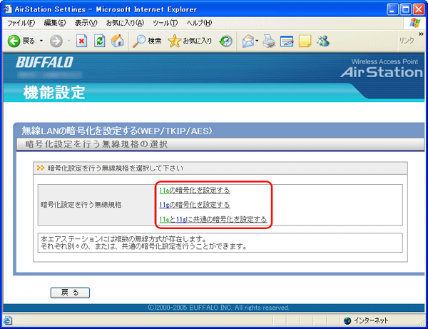(外部からの不正アクセスや無線パケットの解析を防ぐため、802.11a/802.11gの両方に暗号化の設定を行うことをおすすめします)