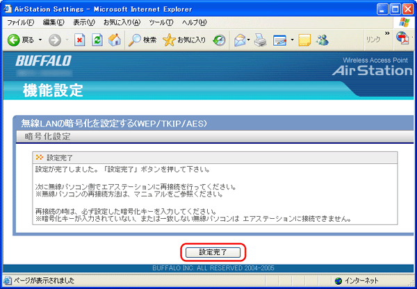 ・ TKIP、AESを使用する場合、無線アダプタがTKIP、AESに対応している必要があります。TKIP、AESの対応については、弊社ホームページの製品情報(http://buffalo.jp/products/catalog/network/wireless_client.html)でご確認ください。 ・ TKIP、AESを使用する場合、AirStationに接続できる無線パソコンは12台以下です。13台以上同時に接続した場合、通信が不安定になります。 ・ 無線パソコンから設定した場合は、すべての無線パソコンが、いったんAirStationに接続できなくなります。その場合は、各パソコンをAirStationに接続し直してください。接続方法は、「AirStationに再接続する」を参照してください。