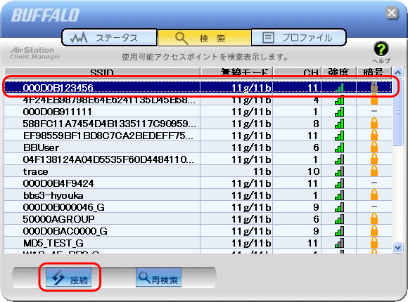 3. 再接続するAirStationを選択し、[接続]をクリックします。AirStationのSSIDの出荷時設定値は、AirStationのシールで確認できます。