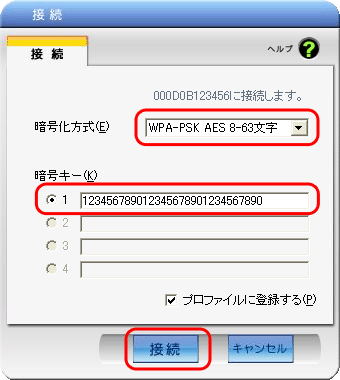 暗号化方式に「WPA-PSK-AES」(または「WPA-PSK-TKIP」)を選択して、設定した暗号キーを入力し、[接続]をクリックします。
