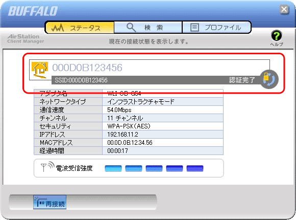 「ステータス」に「認証完了」と表示されれば、AirStationへの接続は完了です。