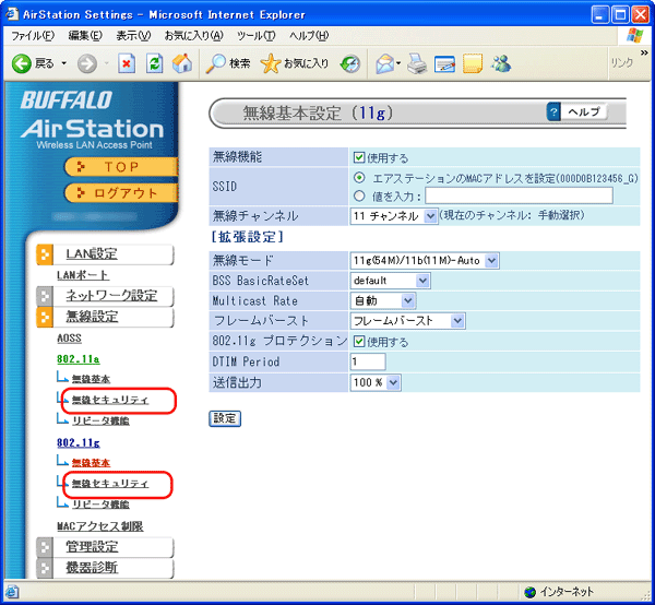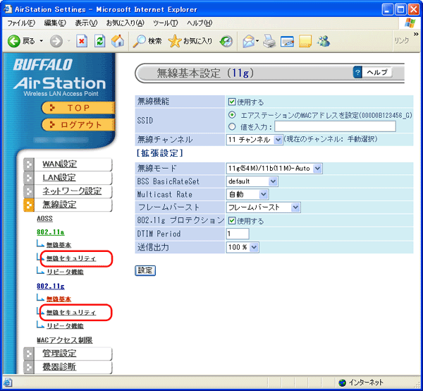 1台目のAirStationと同じ無線方式の[無線セキュリティ]をクリックします。