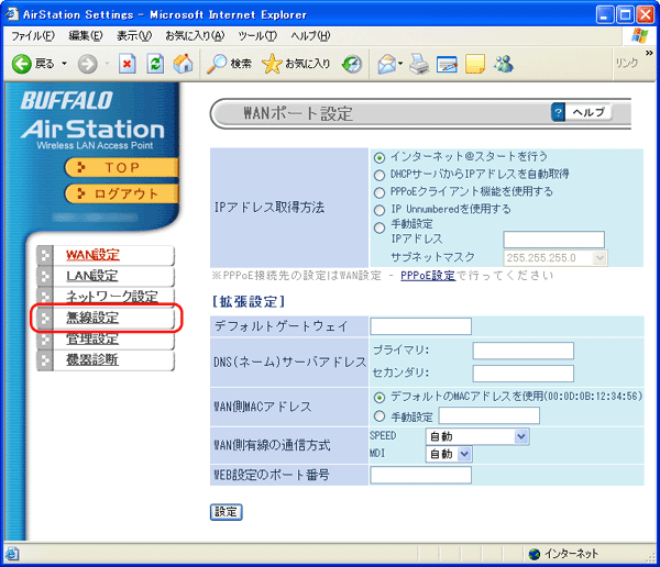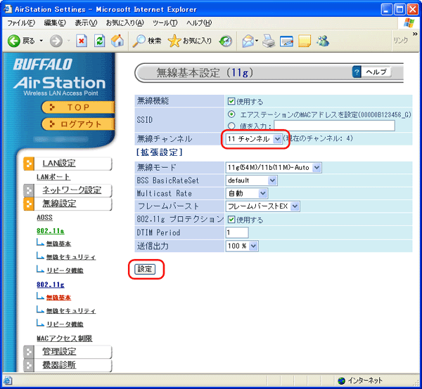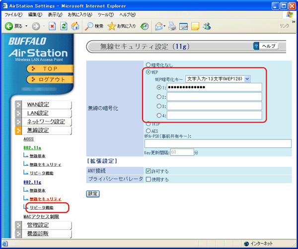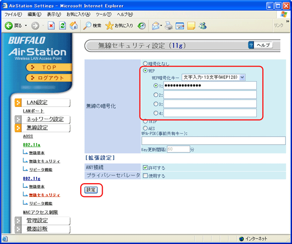 暗号キー(WEP)を入力したら、[設定]をクリックします。