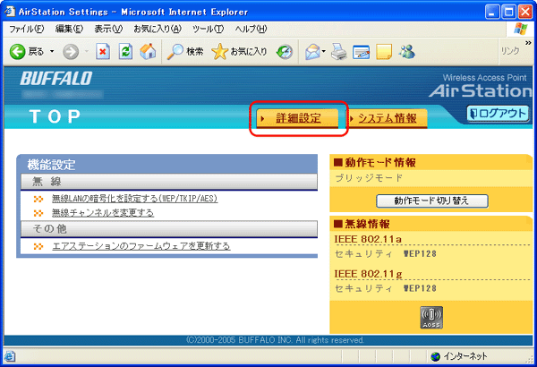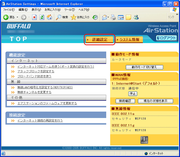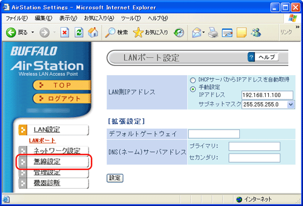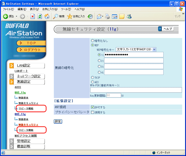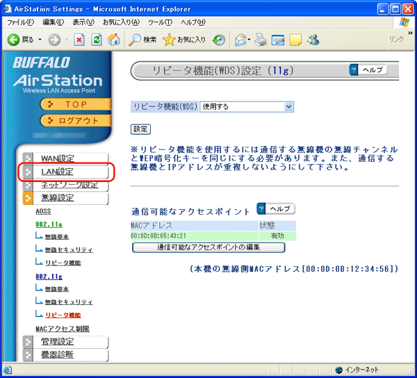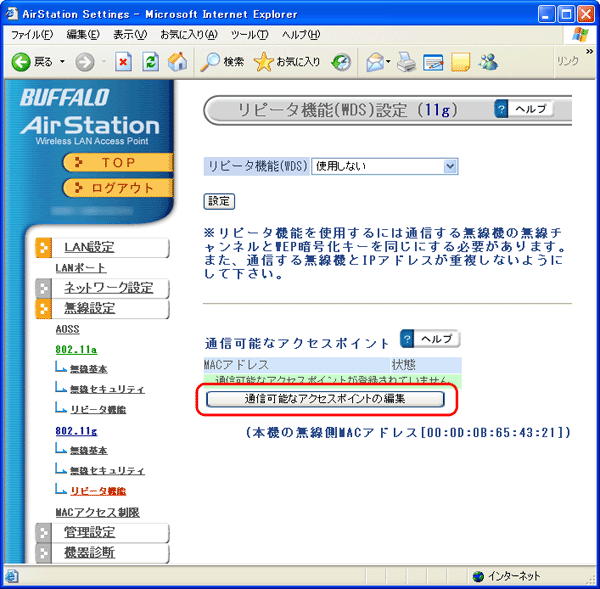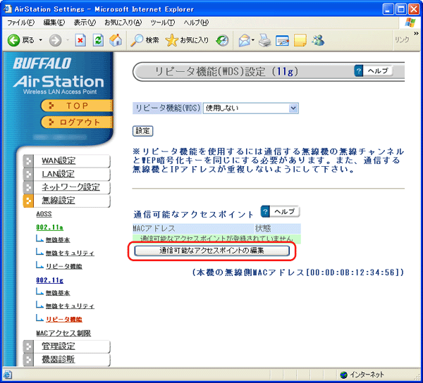 (AirStationの設定画面によっては、リピータ機能の設定項目が「WDS」や「アクセスポイント間通信」になっていることがあります。)