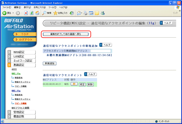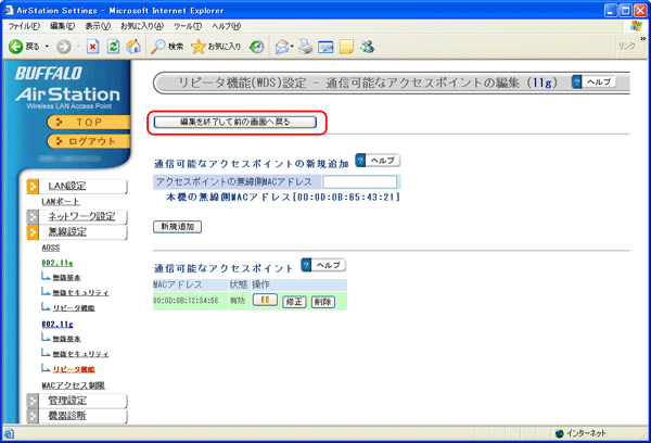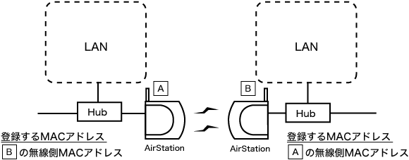 リピータ機能を搭載したAirStation同士で1対1の通信するときは、次の手順を参照して、通信する相手のAirStationの無線側MACアドレスを登録してください。